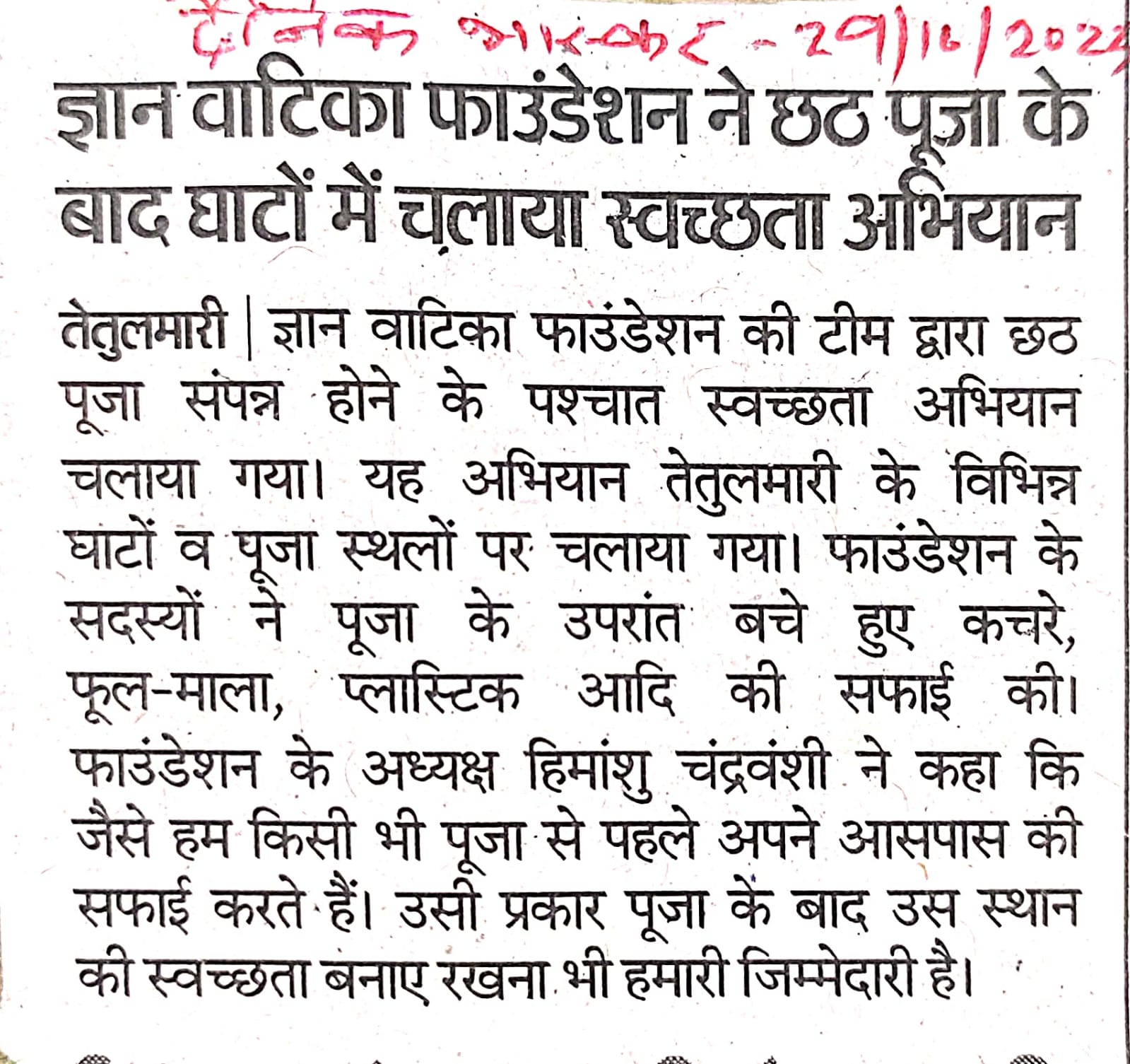 ज्ञान वाटिका फाउंडेशन की टीम द्वारा छठ पूजा संपन्न होने के पश्चात तेतुलमारी घाटों में स्वच्छता अभियान चलाया गया |
