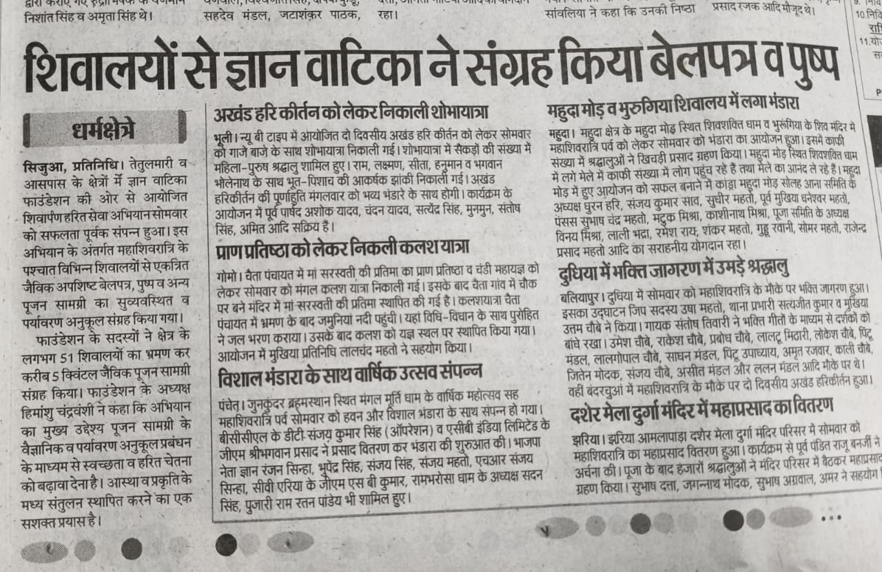 शिवार्पण - हरित सेवा अभियान यह अभियान शिव मंदिरों से एकत्रित जैविक पूजा सामग्री (बेल के पत्ते, फूल आदि) को उचित तरीके से इकट्ठा करने के लिए आयोजित किया गया था, ताकि उन्हें खाद में परिवर्तित किया जा सके और पर्यावरण में वापस लौटाया जा सके।